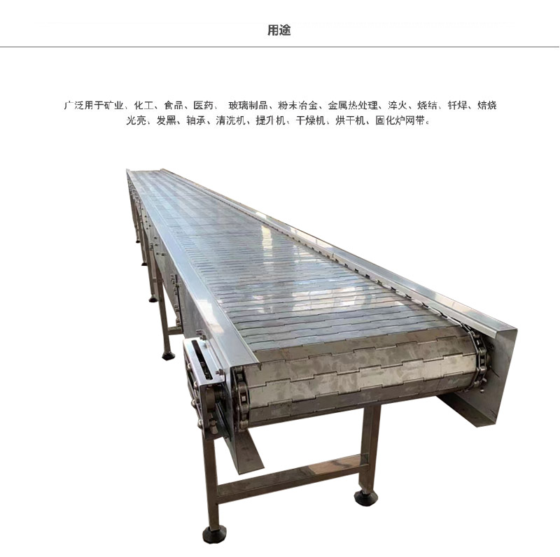 輸送鏈板采用不銹鋼板沖壓成型,鏈條傳動,每節(jié)由6-25mm支撐桿連接,其運動平穩(wěn)、輸送力量大,適合用于輸送細(xì)小的高密度物件,輸送過程中運轉(zhuǎn)平穩(wěn),安裝更換方便,成本高,使用壽命較長。