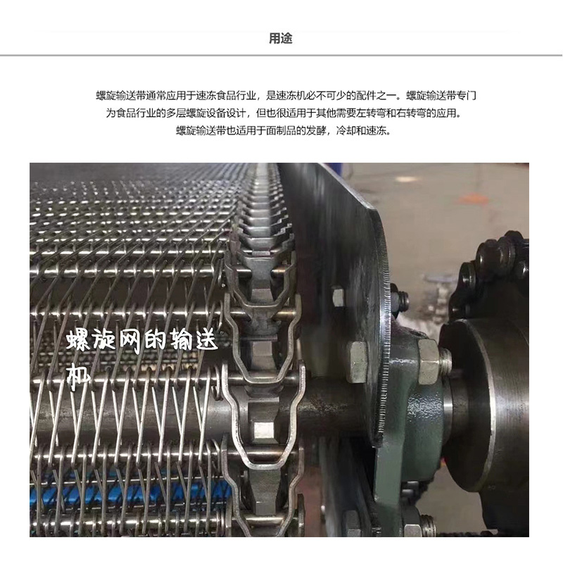 螺旋輸送帶通常應(yīng)用于速凍食品行業(yè),是速凍機(jī)必不可少的配件之一。螺旋輸送帶專(zhuān)門(mén)為食品行業(yè)的多層螺旋設(shè)備設(shè)計(jì),但也很適用于其他需要左轉(zhuǎn)彎和右轉(zhuǎn)彎的應(yīng)用。螺旋輸送帶也適用于面制品的發(fā)酵,冷卻和速凍。