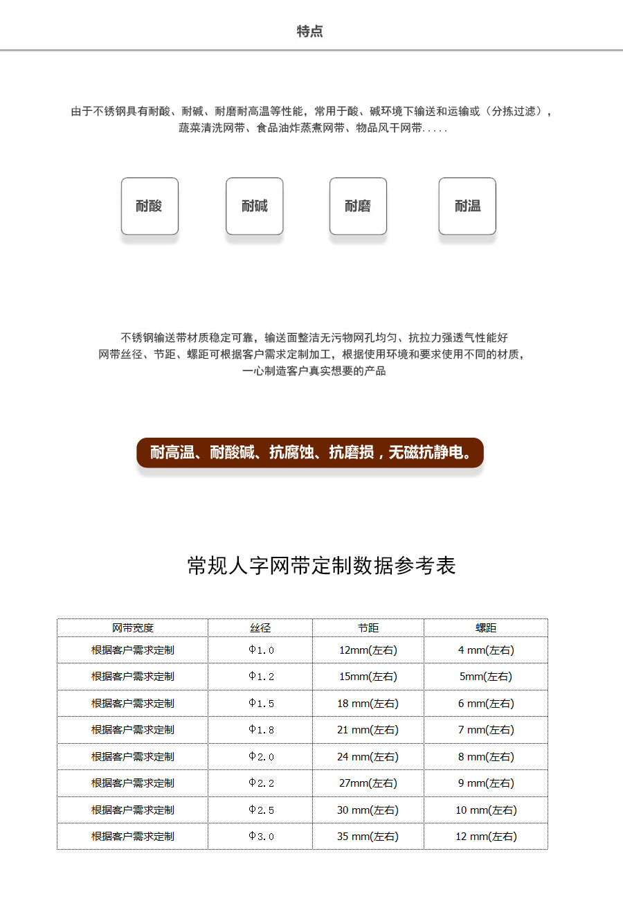 人字網帶具有網面平整、強硬度高、抗腐蝕性強、抗拉強度大、透氣性能好、不易變形、經久耐用。