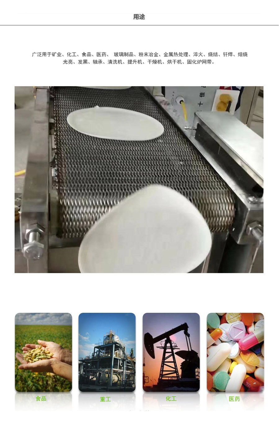 主要應用于玻璃制品行業的退火爐、烤花爐等。食品加工行業、脫水蔬菜、速凍食品單凍機前處理網帶、鏈網。粉末冶金、金屬熱處理、淬火、燒結、釬焊、焙燒、光亮、發黑、軸承、滲碳高溫爐網帶、擋板式網帶、涂裝烘干線輸送網帶、泡沫鎳還原生產線網帶,清洗機、提升機、干燥機、烘干機、固化爐網帶。各輸送工藝鏈網、網帶。